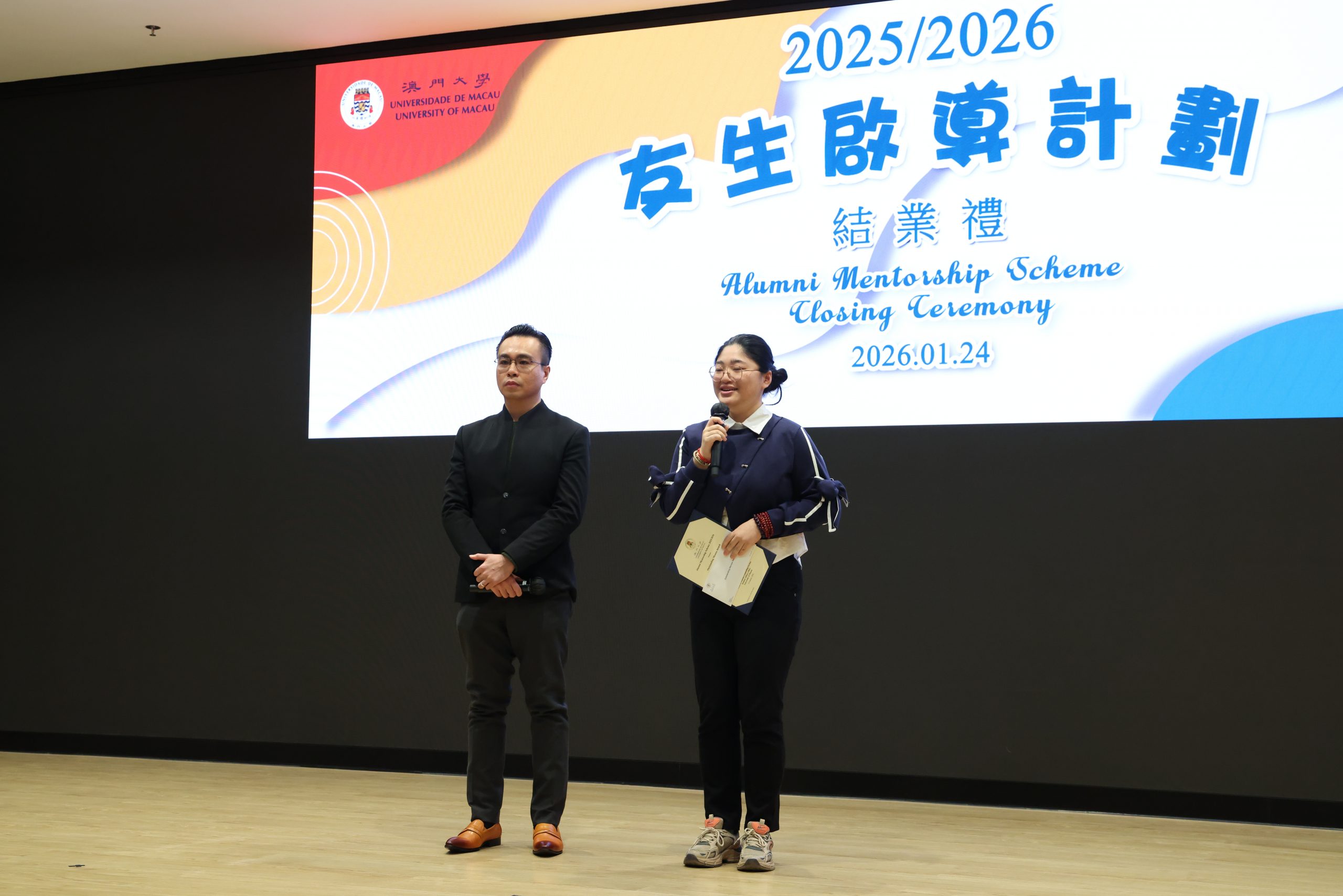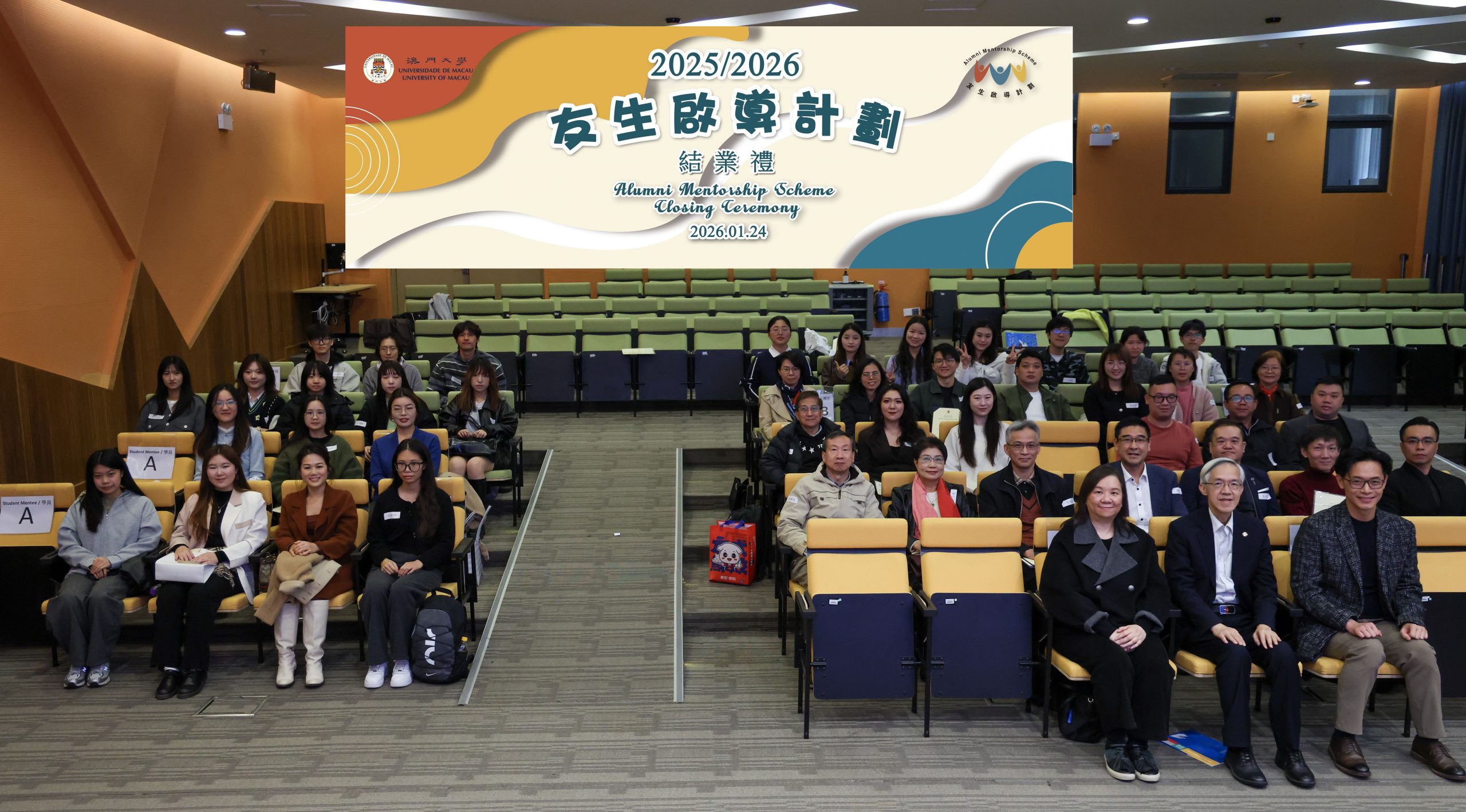 由校友及發展辦公室與學生事務部生涯發展中心合辦的 「2025/2026友生啟導計劃」於1月24日(星期六)在澳門大學伍宜孫圖書館演講廳舉行結業禮。本屆計劃自去年9月啟動以來,成功爲逾80名校友及學生進行配對。校友導師與學員通過一系列團體活動及定期小組交流,積極分享經驗,深化友誼,充分體現了友生互助的精神。